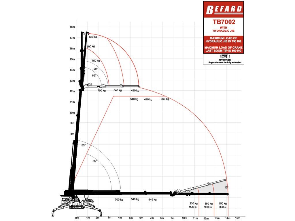 - Vertikální dosah 17,3 m s JIB, horizontální dosah 14,3 m