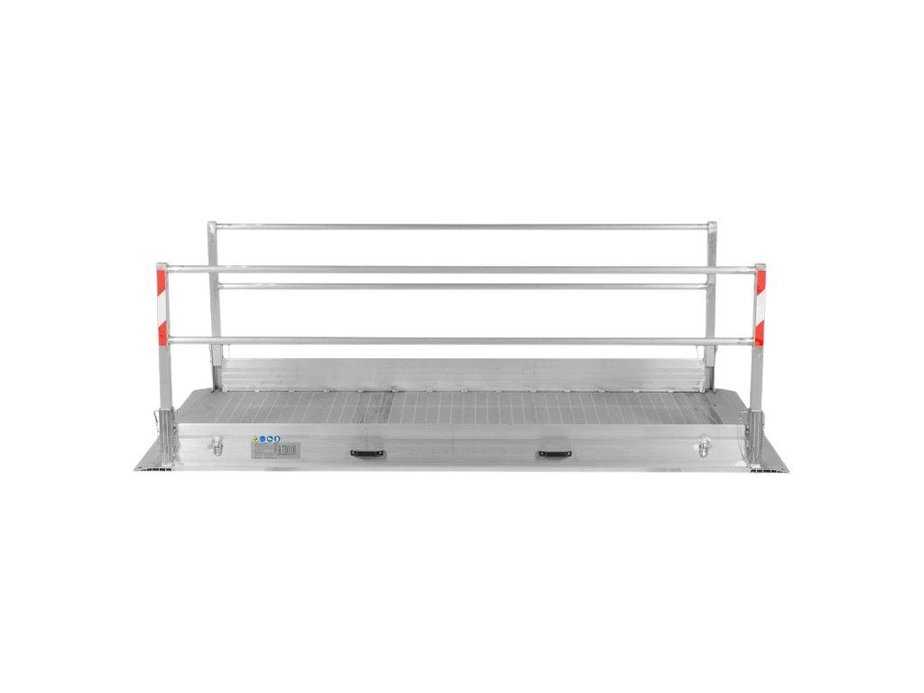 Každá lávka je vybavena sklopným zábradlím pro maximální ochranu uživatelů a protiskluzovým povrchem, který zajišťuje stabilitu i za nepříznivých povětrnostních podmínek. Konstrukce odpovídá bezpečnostním normám pro dočasné přemostění a je vhodná jak pro stavební dělníky, tak pro běžnou veřejnost.