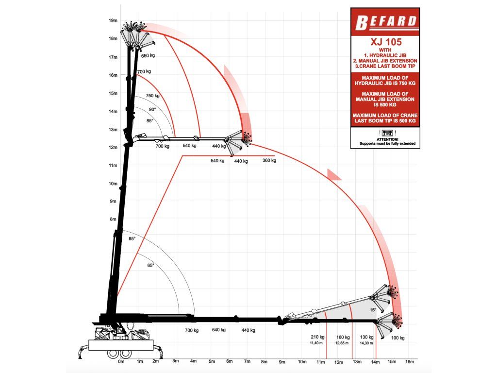 BEFARD XJ105 je profesionální přívěsový minijeřáb s nosností 2500 kg a vertikálním dosahem až 18,8 metru. Výkonný 3 válcový dieselový motor vyrobený v Japonsku (17,1 kW/23,2 HP) v kombinaci s elektrickým napájením 230 V a volitelnou Li-Ion baterií 200 Ah zajišťuje maximální flexibilitu a autonomii provozu.