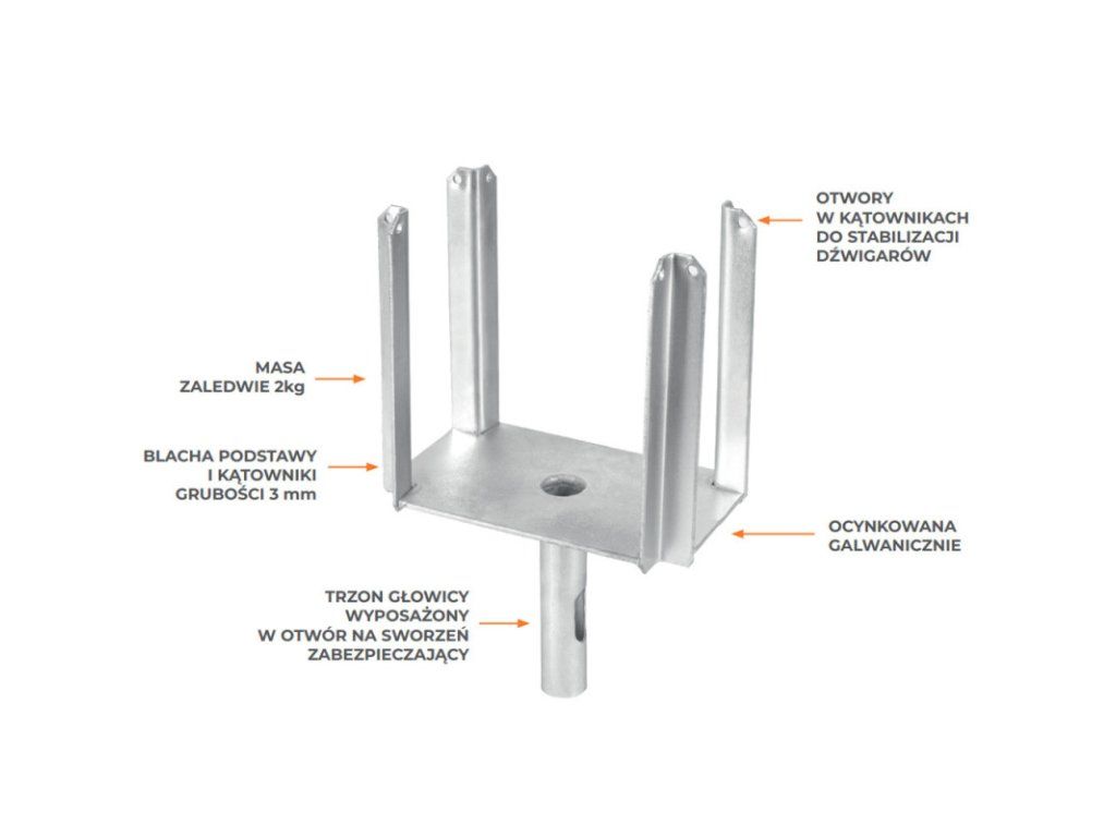Úhlová hlava s křížovým profilem je klíčovým prvkem, který stabilizuje nosníky H20 v systémech stropního bednění. Výrobek se skládá z ocelového plechu a svařené ocelové trubky, umístěné uvnitř podpěry. Konstrukce zajišťuje bezpečné a stabilní uchycení nosníků a zabraňuje jejich pohybu a otáčení. Na opačné straně plechu jsou přivařeny čtyři úhelníky, které nosníky upevňují na hlavě. Elektrogalvanické zinkování chrání prvek před korozí a vlivy nepříznivých povětrnostních podmínek. Výrobek je kompatibilní s lehkými, středními a těžkými podpěrami a umožňuje podepřít jeden nebo dva nosníky v závislosti na jejich rozteči.Doplňkové parametry