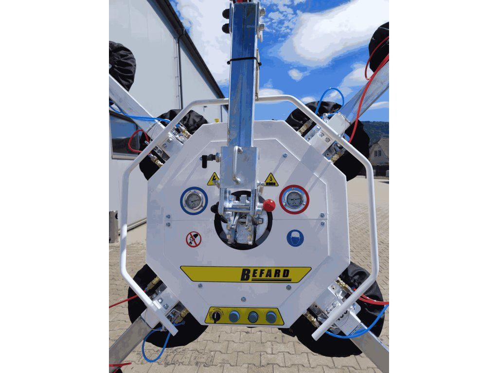 Všestranný vakuový zvedák BEFARD XP602 s nosností 600 kg pro bezpečnou a exaktní manipulaci se zasklením, okenními výplněmi a fasádními konstrukcemi. Stroj je osazen 8 přísavkami o průměru 310 mm a dvojitým vakuovým obvodem, jenž zajišťuje maximální stupeň bezpečnosti. Ruční otáčení 360° se zajištěním po 45° pro precizní umístění. Dvojokruhový systém zaručuje spolehlivé uchycení břemene i při výpadku jednoho z obou samostatných okruhů. Digitální monitoring vakua s indikátorem poskytuje nepřetržitý přehled o aktuálním stavu podtlaku. Vakuový manipulátor XP602 kombinuje odolnost, přesnost a bezpečnost pro profesionální montážní práce. Doplňková výbava zahrnuje např. HS distanční prvky – slouží k nastavení vzdálenosti přísavky podle tloušťky zpracovávaného materiálu.