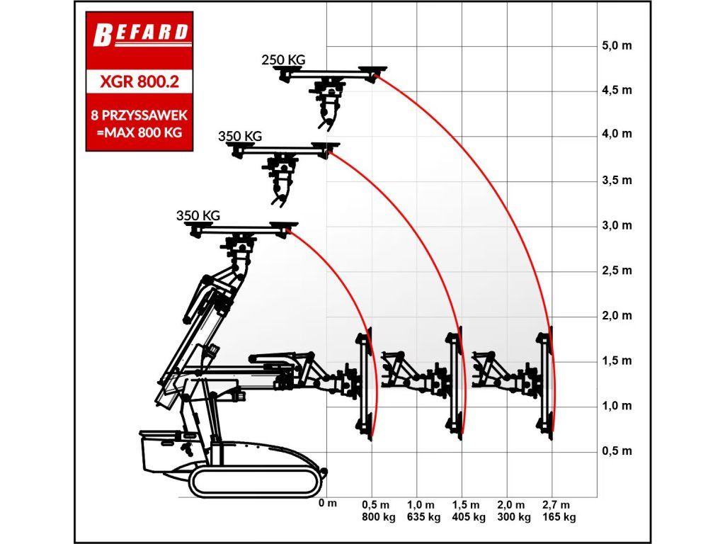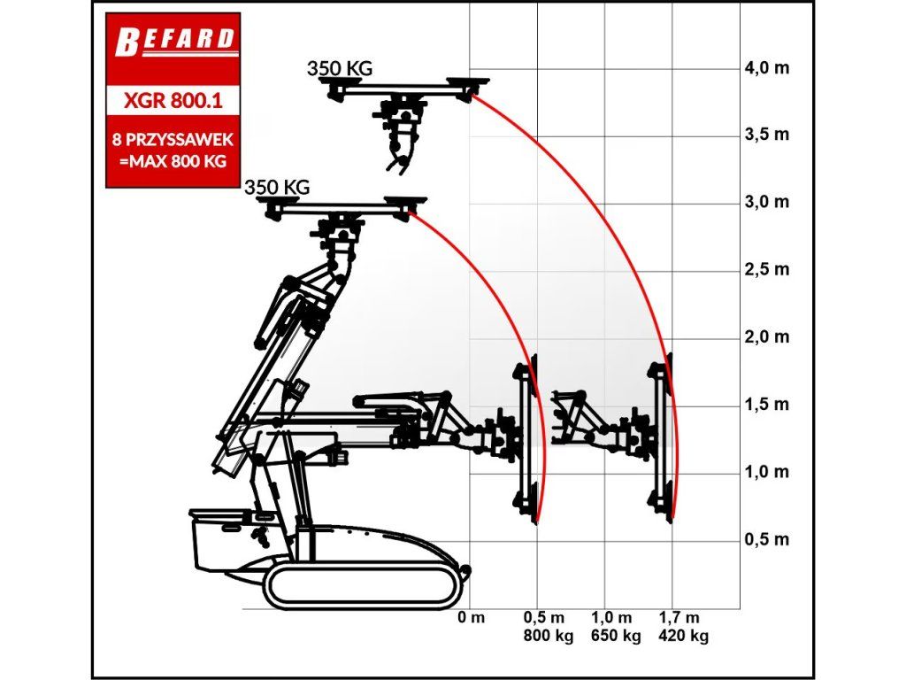Minijeřáb BEFARD XGR800 spojuje moderní technologie s praktickou konstrukcí, která splňuje vysoké nároky profesionálů a stavebních firem. Zařízení je dodáváno se sofistikovaným rádiovým ovládáním, které řídí jak pohyb podvozku, tak manipulaci s nákladem, čímž se zvyšuje bezpečnost práce a komfort operátora. Maximální nosnost 800 kg a vakuový systém s dvojokruhovým systémem přísavek umožňují bezpečné uchopení a manipulaci s nejrůznějšími skleněnými prvky.